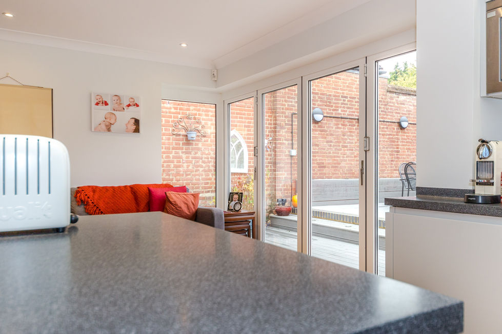 Single storey rear extension creating an open plan Kitchen, Dining and Sitting area with small office space for a retired couple. We added a small 12sqm meter extension to the rear of the property opening up the ground floor to from a fantastic entertaining space with a strong connection to the garden, which can be used all year around. (Conservation Area)